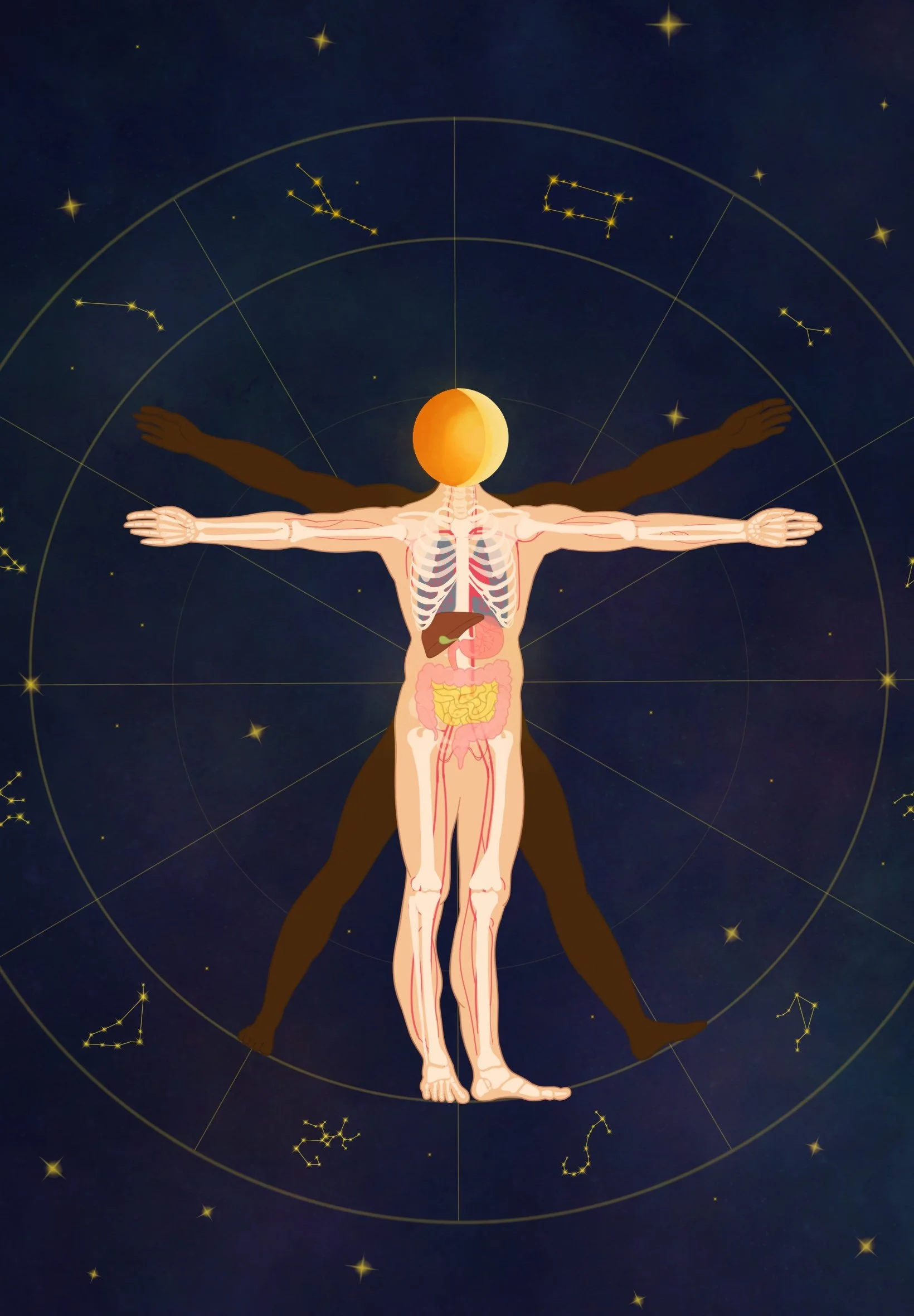 This piece attempts to merge the different disciplines of AFSA while sparking conversation about representation and equity. Leonardo da Vinci’s Vitruvian Man appears dissected with the organ systems, critiquing clinical study's systemic privileging of the western scientific tradition. The Black figure placed behind represents the marginalized perspectives. Both figures are under the same constellations suggesting interconnectedness beyond constructed hierarchies.